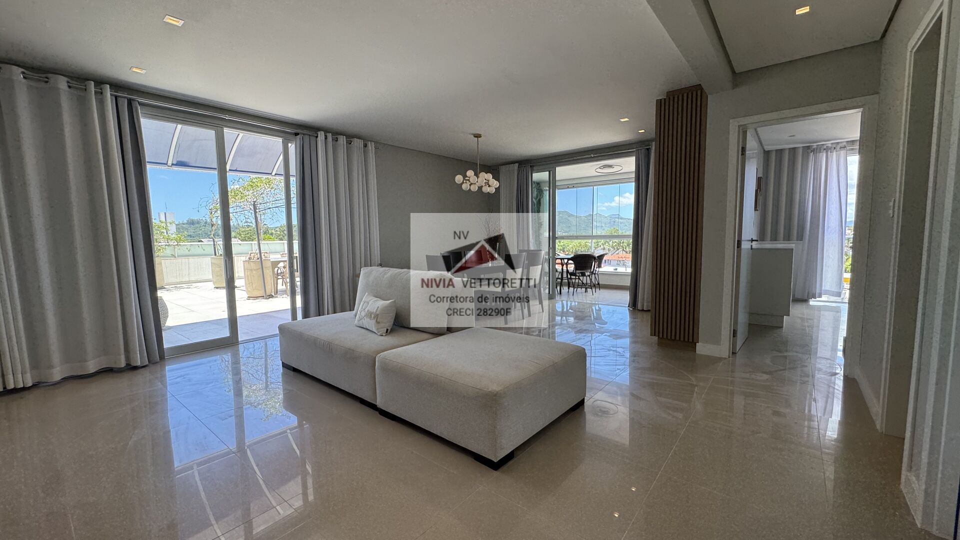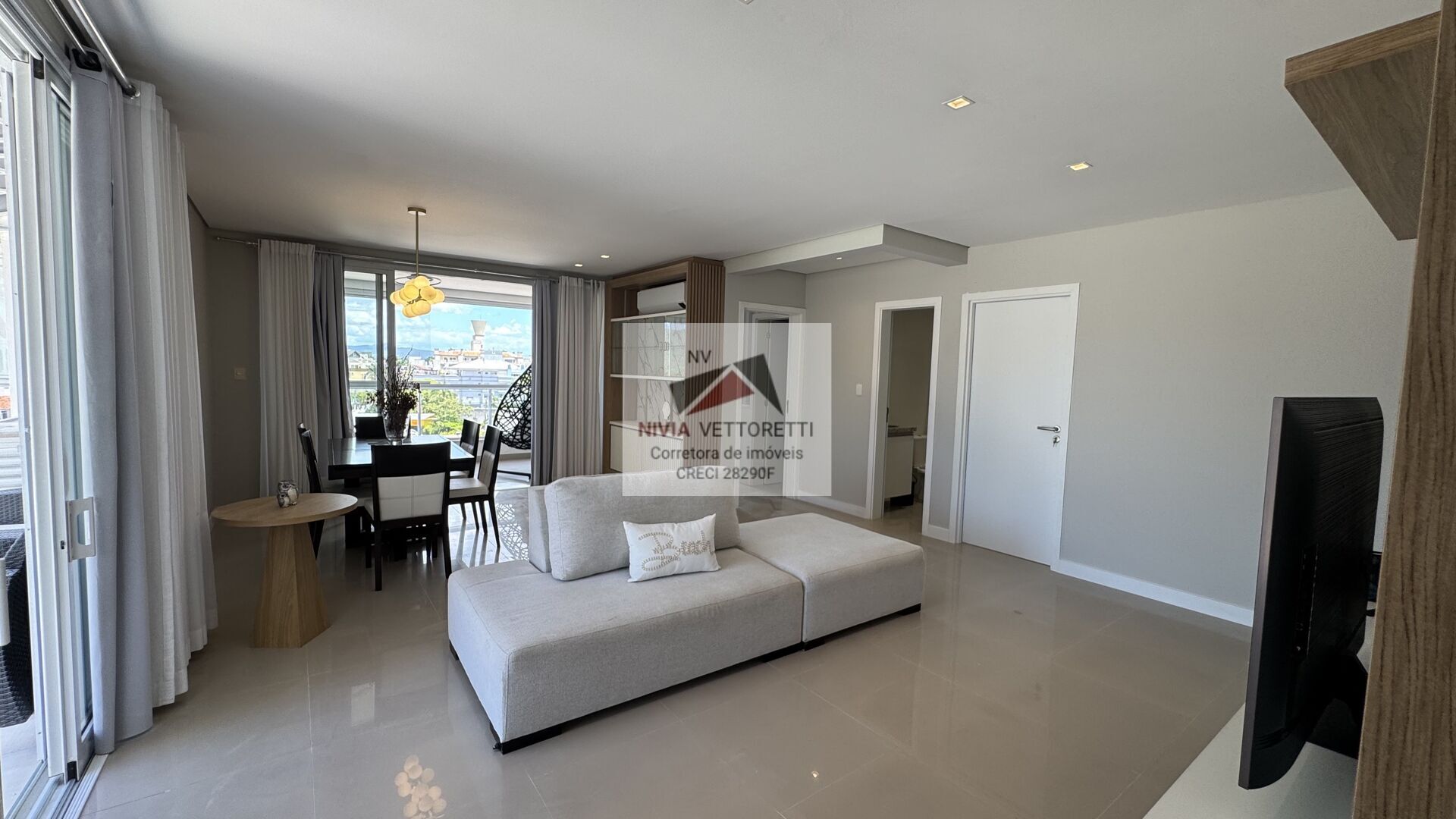 - Sala de estar e jantar integrada, com sacada e vista para o mar