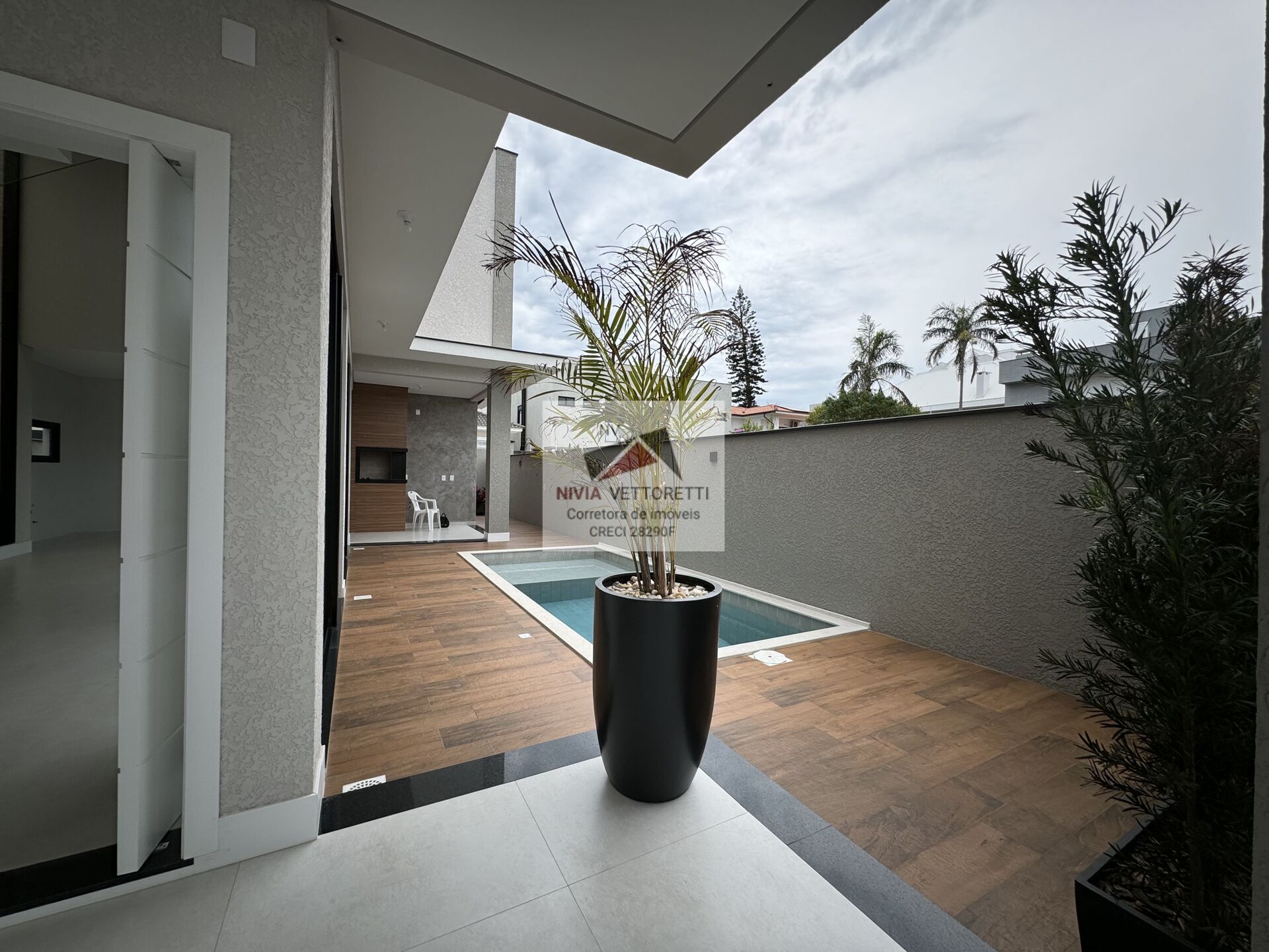 Os ambientes são integrados, com sala e cozinha em conceito aberto, proporcionando uma sensação de amplitude e modernidade. A área gourmet, perfeita para receber convidados, conecta-se com a piscina já construída, ideal para momentos de lazer. A casa conta com garagem dupla coberta, persianas elétricas e fechaduras eletrônicas, proporcionando praticidade e segurança.