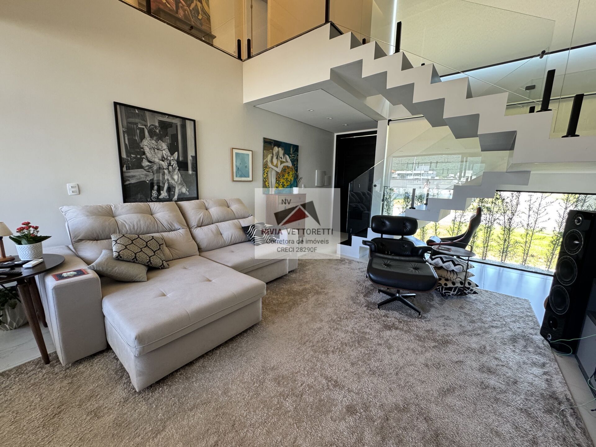 •Sala com pé direito duplo integrada à cozinha e à área gourmet.