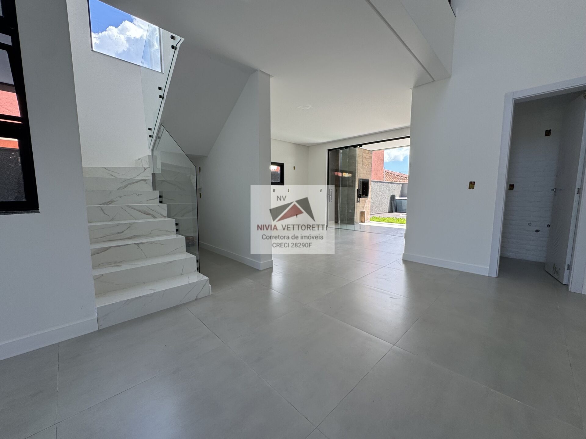✔ Escada revestida em porcelanato com peitoral de vidro, agregando sofisticação ao design do imóvel.
