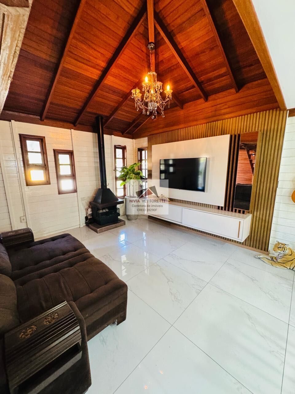 A área social é integrada e aconchegante, com cozinha sob medida, lareira a lenha e ambientes bem iluminados.
